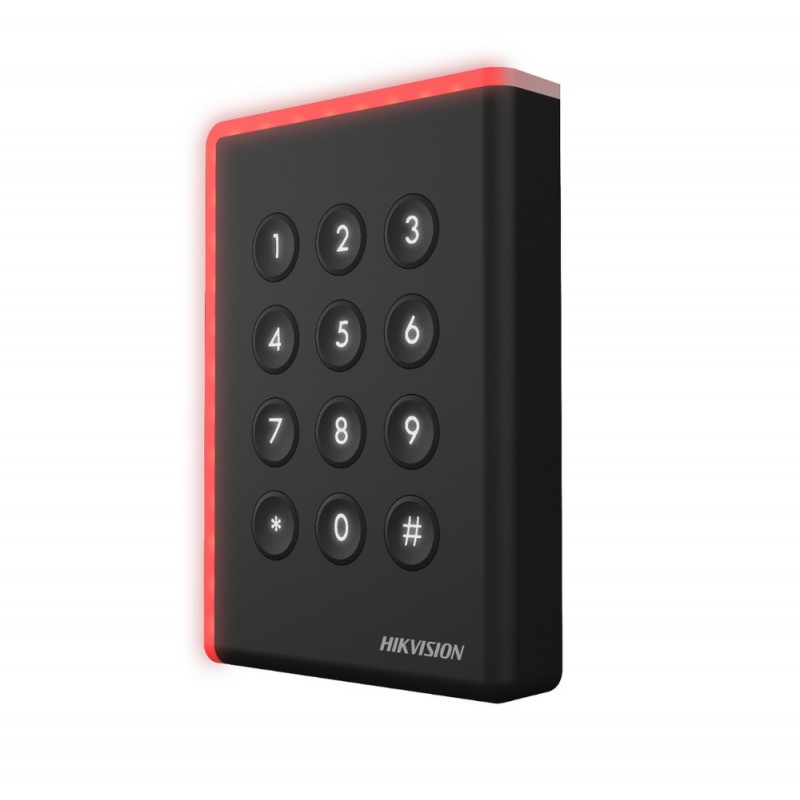 Cititor card cu tastatura Hikvision DS-K1801EK, frecventa de operare RFID EM125KHz, conectivitate: Wiegand 26/34 protocol, distanta de citire: max. 50mm, tastatura cu 12 butoane, Led de stare, alimentare; 12VDC, dimensiuni: 87mm × 87mm × 13.3mm, IP 65, gr