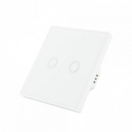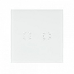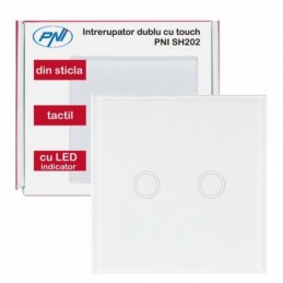 Intrerupator dublu cu touch PNI SH202 din sticla, alb cu LED indicator, Butoane iluminate - Butoane tactile - Front din sticla, Sarcina maxima suportata: 200 W, Dimensiuni: 85 X 35 X 85 mm, Greutate: 120g,