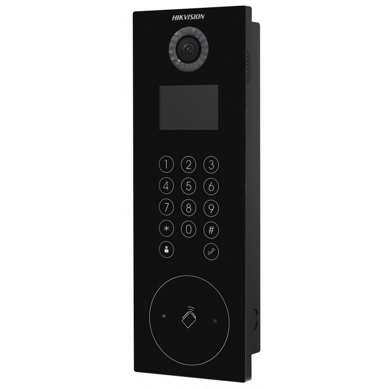 Post videointerfon de exterior pentru blocuri Hikvision DS-KD8103-E6, monitor LCD color 3.5-inch, rezolutie 480 × 320, camera video 2MP HD, unghi vizualizare: 120° wide, deschidere cu card si cod pin, capacitate utilizatori: 10000, capacitate conectare p