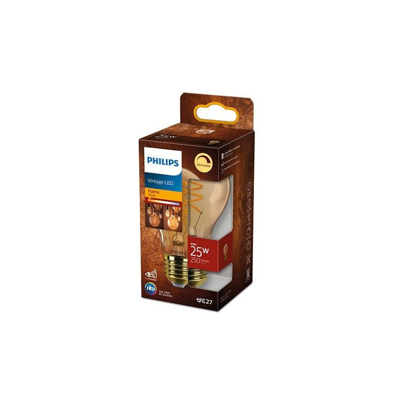 Bec LED vintage Philips Classic A60, intensitate luminosa reglabila, E27, 4W (25W), 250 lm, lumina calda tip flacara (1800K), Auriu