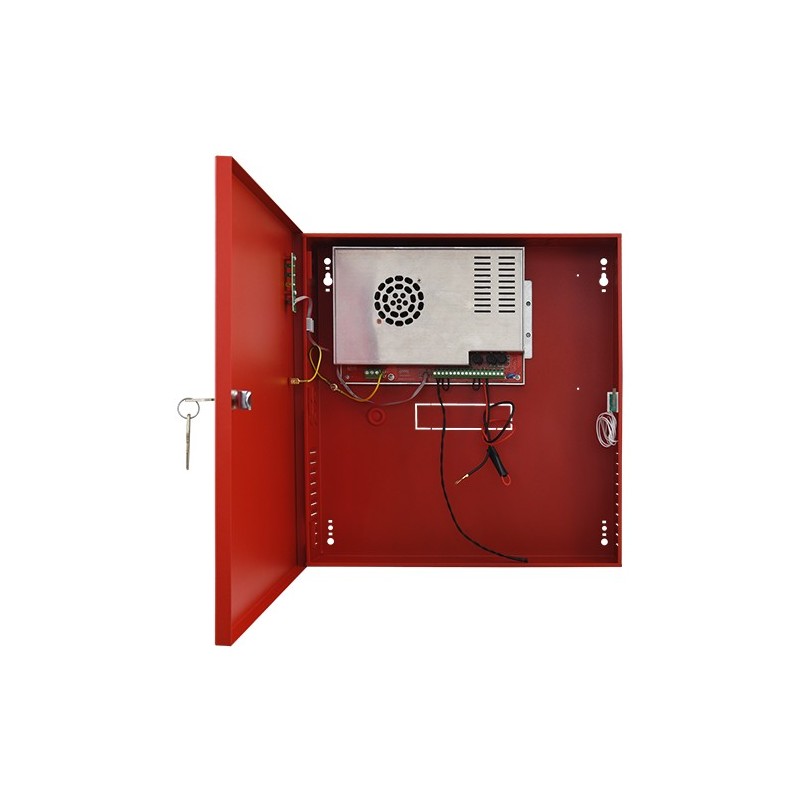 Sursa auxiliara pentru sistemele de incendiu, montare aparenta, incuietoare cu cheie, carcasa metalica rosie.Protectie: scurt-circuit, suprasarcina, supraincalzire, supratensiune si tamper.Iesiri pentru conditie de defect: EPS - defect tensiune intrare, A
