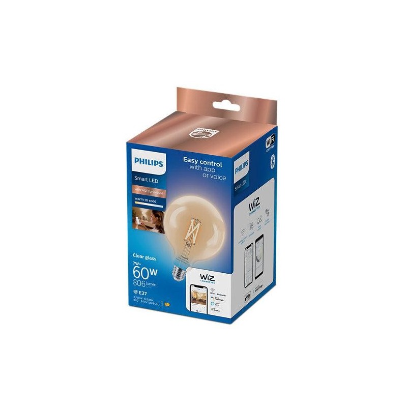 Bec LED RGB inteligent Philips Filament Bulb A60, Wi-Fi, E27, 6.3W (40W), 470 lm, lumina alba si color (2200-6500K)