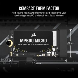 SSD CORSAIR MP600 MICRO Capacitate 1TB M.2 2242 NVME PCIE GEN4 x4 Viteza de scriere: pana la 4300MB/s Viteza de citire: pana la 5000MB/s Temperatura de functionare: 0-65°C Temperatura de stocare: -40-85°C Voltaj: 3.3V +/-5%