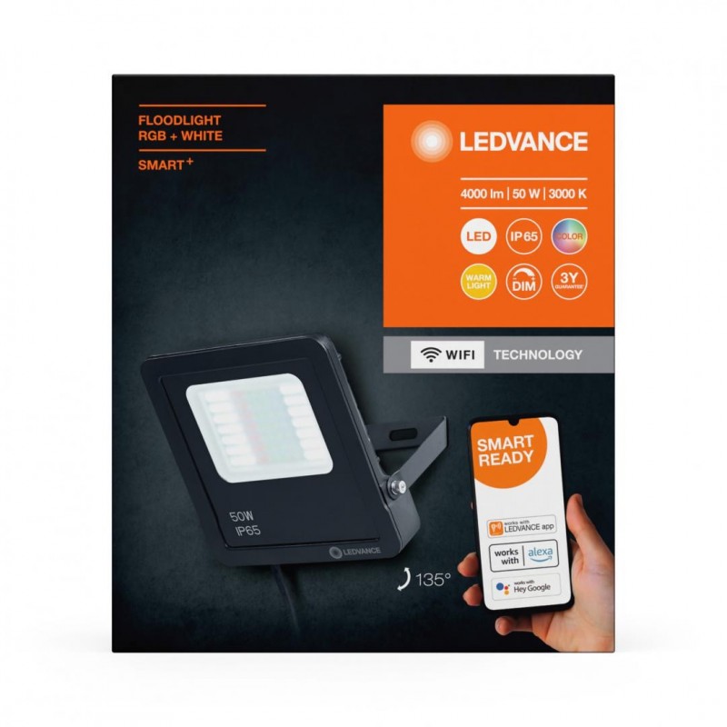 Proiector LED RGB inteligent Ledvance Smart+ WiFi, 50W, 3000 lm, lumina alba si color (3000K), dimabila, IP65, 237x204x36mm, Negru, clasa energetica F