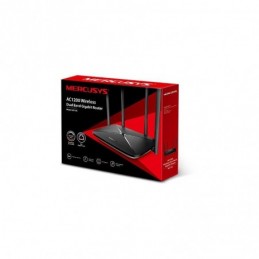 AC1200 Wireless Dual Band Gigabit Router Mercusys, AC12G; Wireless Standards: IEEE 802.11a/n/ac 5 GHz, IEEE 802.11b/g/n 2.4 GHz; Frequency: 2.4 - 2.5GHz, 5.15 - 5.85GHz; 4x Fixed Omni-Directional Antennas; Signal Rate: 300 Mbps at 2.4GHz, 867 Mbps at 5GHz; 1x Gigabit WAN Port, 3x Gigabit LAN Ports; External Power Supply: 9 VDC/ 0.85 A;